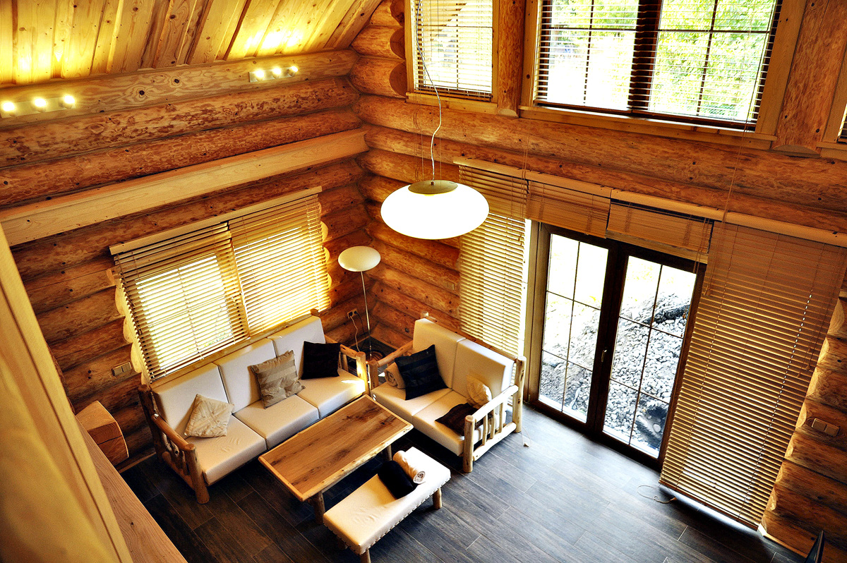 "A netradičné tvary, ako napr., Hobitej 'kruhový,, nahrubo' vyrezaný vchod do kuchyne, ktorý presvetľuje celodenne ďalšie izby a kde zapadajúce slnko poskytuje čarovnú hru odleskov. Čo sa nám veľmi páči, "hovorí s úsmevom majiteľ. Voľný priestor otvoreného prízemia bez dverí a horné galérie odľahčujú a zjemňujú masívne konštrukciu domu. Uzavreté sú iba technická miestnosť s plynovým kotlom a kúpeľňa so sprchou.