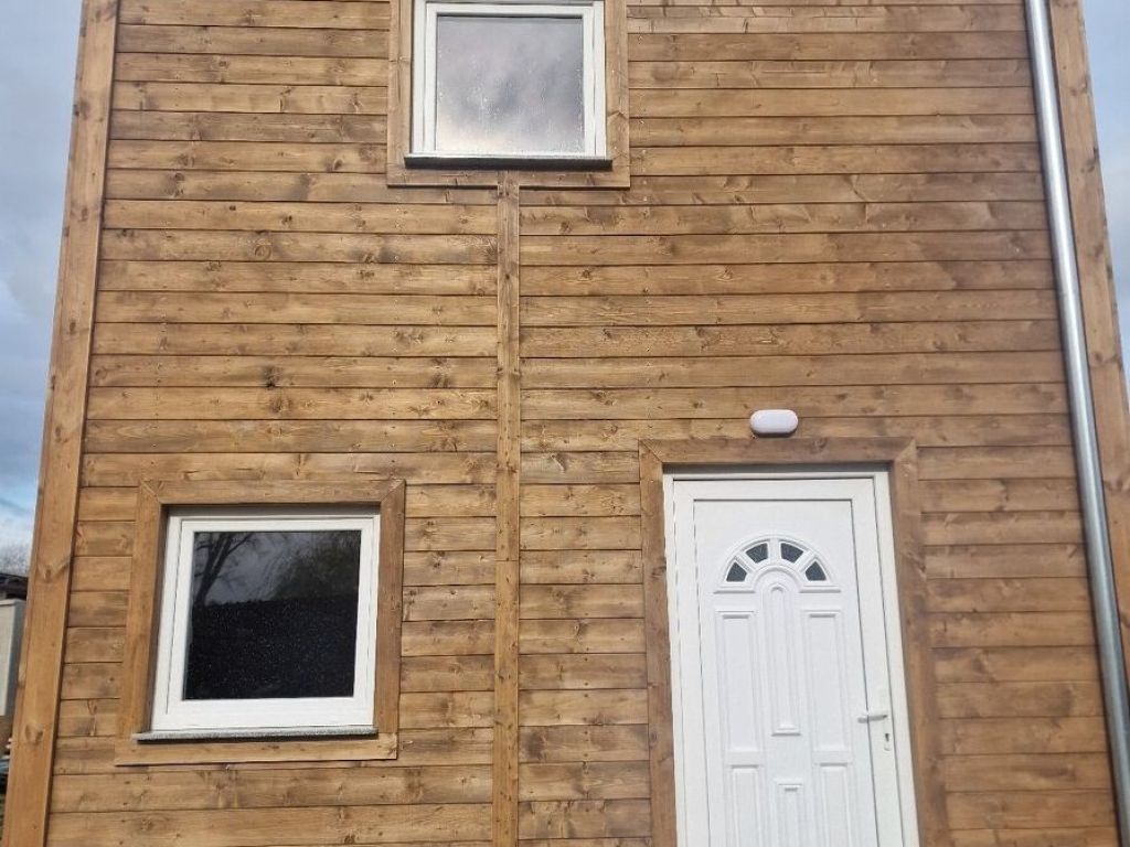4,45 x 3,85m, přízemí + podlaží, venkovní palubky, vnitřní palubky pálené + lazura, zásuvky, vypínače, 1 fáz 240V, přípravana kuchyňskou linku, v přízemí linoleum, patro koberec, Horní úložné prostory, osvětlení, obložkové zárubně, dveře, sprchový kout 90x90cm, umyvadlo se skříňkou, WC + bidetka, ohřívač vody 80L, sprchový set, zrcadlo, připojení na pračku, topný žebřík, vytápění horní i dolní patro.
