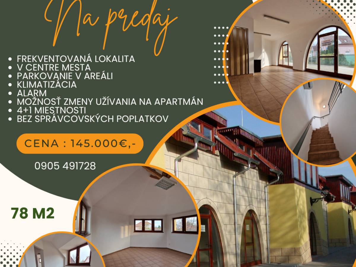 Hľadáte ideálne miesto na podnikanie alebo hľadáte investičnú príležitosť?❤️ 📍Ponúkam Vám na predaj/ na prenájom obchodný / administratívny priestor v centre mesta Dunajská Streda na podnikateľské účely. 🏣LOKALITA: Obchodný priestor sa nachádza na začiatku pešej zóny v Dunajskej Strede, vo frekventovanej lokalite s vysokým pohybom ľudí, v blízkosti vlakovej a autobusovej stanice.🚄 📐Dispozičné riešenie Celková rozloha priestoru je 78,74 m2 a pozostáva z prízemnej časti (H1 27,44 m2) a z poschodia (H2+J2 51,3 m2). Jedná sa o dvojpodlažnú budovu s veľkými presvetlenými drevenými eurooknami, v ktorej sú k dispozícii 4 miestnosti, samostatné sociálne zariadenie, klimatizácia, podlahové kúrenie, alarm, telefónne linky a samostatné merače. 📌Vchod do budovy je dobre viditeľný a prístupný priamo z pešej zóny. 📌Nezariadený priestor. 🚘PARKOVANIE: Prístup k objektu je zo strany ulice. Zásobovanie má samostatný vstup s možnosťou príjazdu auta až priamo k zadným dverám objektu cez areál SAD. CENA: 145 000 EUR vrátane DPH Priestor je vhodný na akúkoľvek činnosť v rámci obchodu, služieb a gastronómie. Objekt ponúka široké možnosti využita - ideálne ako: obchodné priestory, butiky kancelárie kaderníctvo salón krásy služby sklad alebo ľahká výroba gastronómia
